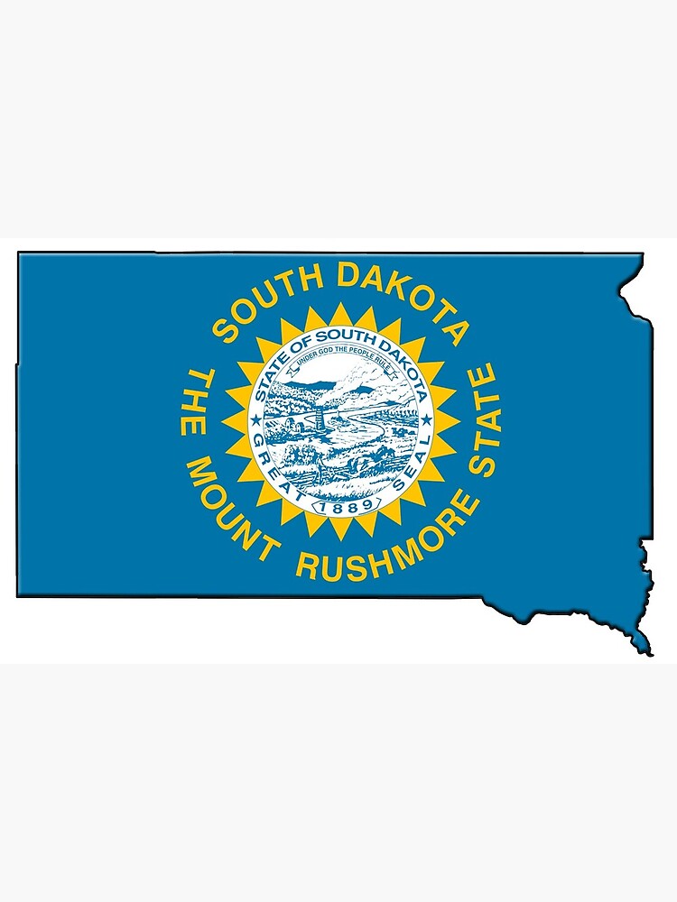The Mount Rushmore State. It is also part of the Great Plains region. The flag of the state of South Dakota is a field of sky blue charged with a navy blue and white version of the state seal in the center surrounded by gold triangles representing sun rays surrounded in turn by inscriptions in gold sans-serif capitals of SOUTH DAKOTA on top and THE MOUNT RUSHMORE STATE the state nickname on the bottom.